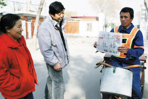 “環(huán)衛(wèi)工人征婚,電話28128919”。昨天上午10時(shí)許,在本市河西區(qū)珠江道,一名男性環(huán)衛(wèi)工公開(kāi)征婚的招牌,吸引了路人的目光。“起初我也抹不開(kāi)面兒,隊(duì)長(zhǎng)告訴我說(shuō),大學(xué)教授還公開(kāi)征婚呢,沒(méi)什么不好意思的!碑(dāng)事人老崔紅著臉解釋說(shuō)。