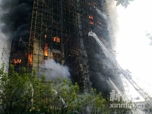 16時(shí)20分,大火持續(xù)了兩個(gè)多小時(shí)還未被撲滅,大樓內(nèi)仍有居民尚未逃出,頂樓還有不少被困居民在等待救援。新民網(wǎng)記者在現(xiàn)場(chǎng)看見(jiàn),經(jīng)過(guò)大火猛烈的炙烤,已經(jīng)有腳手架在往下掉落了,現(xiàn)場(chǎng)十分危險(xiǎn)。