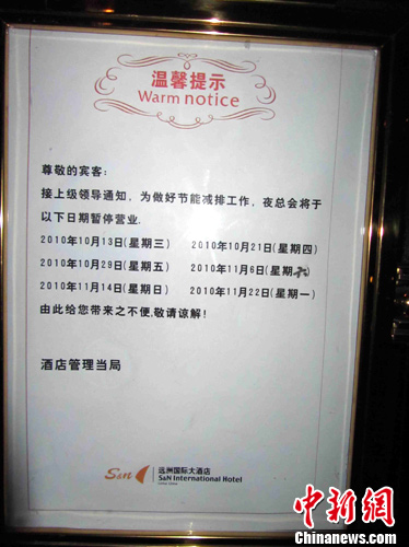 在四星級(jí)的臺(tái)州國貿(mào)飯店大堂,記者看到一張通知:接文廣新局通知,本市娛樂行業(yè)將要進(jìn)行節(jié)能減排輪休,因此本飯店(KTV)在10月25日、11月2日、11月10日、11月18日暫停營業(yè)。