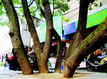 同一條根,6個主枝,在芙蓉中路三段145號一家店鋪前有這樣一棵罕見的“6胞胎”樟樹。其中最粗的160厘米,最細(xì)的也有80厘米,通高21米,樹冠面積70—80平方米。