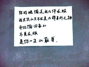原來,孫女士的鄰居何女士前晚將孩子的衣服晾在門外,第二天忽然發(fā)現(xiàn)幾件衣服不見了,一時郁悶不已的何女士便寫了這首小詩告誡小偷,同時提醒鄰里注意保管好財物。 昨天早上,家住昌平的孫女士剛一出門,就看到鄰居家門外的墻上貼了一張紙,上面有幾行字,字體娟秀,讀起來像是一首小詩!澳阕蛲硗底呶?guī)准路襾G失的只不過是幾樣身外之物,而你偷回家的,不是衣服,是你一生的恥辱。”