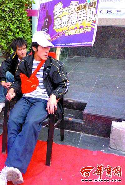 兩位 “靜坐者”的這一行為不時(shí)引來(lái)路人的注意和評(píng)論。兩人在“坐等”免費(fèi)手機(jī)的同時(shí),也成為了商家的活宣傳廣告。(記者 寧峰攝影報(bào)道)