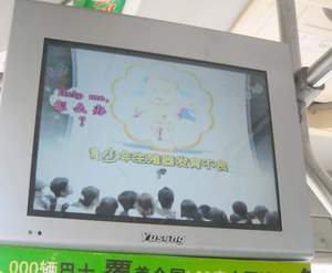 6日上午10時20分,記者在龍昆南路海師大門口處的車站登上了42路公交車。此時,設在司機后座上方的一個顯示器里,正滾動播出視頻廣告。廣告的內(nèi)容有電影廣告,食品廣告等。