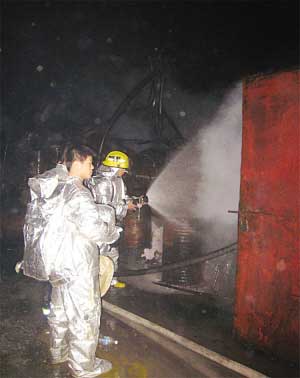 江寧區(qū)消防大隊(duì)東山中隊(duì)的中隊(duì)長(zhǎng)鄭先平告訴記者,到達(dá)現(xiàn)場(chǎng)前,1號(hào)儲(chǔ)罐已經(jīng)發(fā)生爆炸,火焰有幾十米高,爆炸后,產(chǎn)生的流淌火在地面上蔓延,離1 號(hào)儲(chǔ)罐相隔兩米遠(yuǎn)的2號(hào)儲(chǔ)罐周?chē)鷶[了兩百多個(gè)塑料桶,桶內(nèi)裝的是廢棄乳化液。流淌火吞噬了塑料桶,接著,一個(gè)個(gè)裝廢棄乳化液的桶就像一串串鞭炮一樣跳躍著炸了起來(lái)。此時(shí),中隊(duì)的三名班長(zhǎng)和一名新隊(duì)員一邊抱水槍給2號(hào)儲(chǔ)罐降溫,一邊向廢棄乳化液桶上噴灑泡沫,但火勢(shì)太猛根本無(wú)法控制。塑料桶爆炸氣浪擊起的廢棄乳化液濺到了他們的面部和眼睛,他們四人頓時(shí)感到眼睛紅腫,皮膚有灼痛感,大家并沒(méi)有后退,而是戴上空氣呼吸器繼續(xù)戰(zhàn)斗。此時(shí),鄭先平見(jiàn)情況不妙,2號(hào)罐已經(jīng)被大火吞噬,漸漸地罐體被燒得通紅,眼看支撐罐體的鋼架也要被高溫熔化了,鋼架的松動(dòng)發(fā)出“咯咯”的響聲,隨時(shí)有倒塌爆炸的危險(xiǎn),鄭先平立即命令所有隊(duì)員后撤。大家接到后撤命令后迅速跑開(kāi),剛撤出不遠(yuǎn),身后發(fā)生天崩地裂的巨響,2號(hào)儲(chǔ)罐爆炸了,幾十米高的火焰在夜空中拼命地扭動(dòng)著“身軀”。直到其他消防車(chē)和隊(duì)員們相繼趕到,大家繼續(xù)和火魔戰(zhàn)斗。被廢棄乳化液噴濺的三名班長(zhǎng)和一名隊(duì)員傷情逐漸明顯,連夜被送到醫(yī)院救治,目前已無(wú)大礙。據(jù)了解,爆炸的兩個(gè)儲(chǔ)罐內(nèi)裝的都是廢棄乳化液,兩個(gè)儲(chǔ)罐加起來(lái)重量達(dá)30噸。