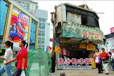 但就在商廈的門口和旁邊,散立著3棟孤零零的破舊房子,它們的外墻一片狼藉,很明顯,曾經(jīng)連接它們的其他房子都已經(jīng)拆掉了,變成了廣場的一部分,而它們卻繼續(xù)堅定地站在繁華的商業(yè)大廈面前?瓷先ザ嗌儆行┎粎f(xié)調(diào)。