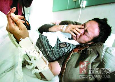 記者看到李君鐘時(shí),他正準(zhǔn)備做手術(shù),主治醫(yī)生告訴記者,李君鐘多處軟組織挫傷,頭部受傷縫了7針,左臂骨折,傷情跡象表明,肯定是嚴(yán)重的外力所致。“我怎么這么倒霉!因?yàn)檎也坏阶约旱能,就挨了一頓打!”說(shuō)起當(dāng)晚的情形,李君鐘忍不住淚流滿面,他說(shuō),當(dāng)晚,因?yàn)楹团笥讯嗪攘藥妆浀米约旱能囃T阱\苑花園小區(qū)門口,但可能是喝多了,到門口一看,卻怎么也找不著車了,難道車被偷了?他趕緊四處找車,不知不覺就進(jìn)了小區(qū)。剛進(jìn)小區(qū),突然有幾名保安跑過(guò)來(lái),二話沒說(shuō)就開始打他……