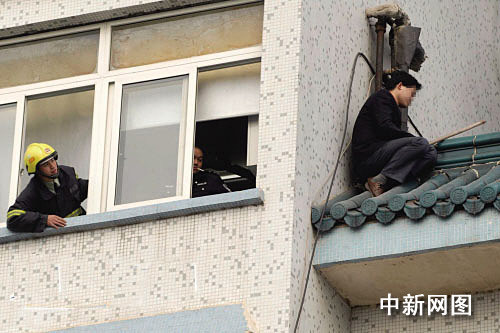 欲跳樓的男子手持一根一米長的帶釘木棍,半蹲半坐地倚在四樓樓頂?shù)墓战翘帲粩鄵]舞著木棍防止他人靠近。在二樓的平臺上,派出所民警嚴(yán)陣以待,隨時準(zhǔn)備處置突發(fā)事件。四樓樓頂,艱難的談判正在進行,衛(wèi)生部門的一位負(fù)責(zé)人與男子不停地交流著,此時男子的情緒相對穩(wěn)定,但只要看到民警靠近,男子就會立刻警覺,并將身子向樓頂邊緣靠去。