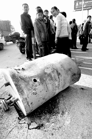 從楊高南路看進去,加油站里面三座加油機尚且完好。而最靠浦三路的一臺平時為助動車加氣的加氣裝置已經面目全非,底面積約四十平方米的地下貯氣罐被炸出地面。東側的楊高南路,西側的浦三路,包括更遠處的昌里東路上,散落著大大小小的碎石,一個直徑半米左右的鐵罐,將楊高南路的非機動車道砸出了一個洞。