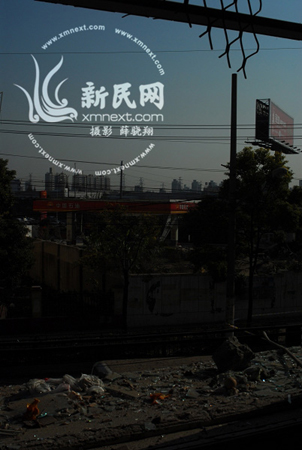 浦三路上的居民小區(qū)、商鋪很多,一些路人受了輕傷,店鋪的玻璃被砸破。浦三路830號是一家花鳥市場,距離爆炸現(xiàn)場約有300米遠。在不到50平方米的花鳥市場空地上,全都是飛過來的碎石、管子。在市場門口,一輛自行車倒落在地,另外還有一輛裝有鐵板的三輪車,“他們的頭都被砸破了,全都送醫(yī)院去了。”市場內的一位王老板指著自己的腦袋說,“我當時騎著助動車出去,就看到一大片石頭飛過來,我們幾個人都被砸到了,我都被砸了一個‘瘤’出來!