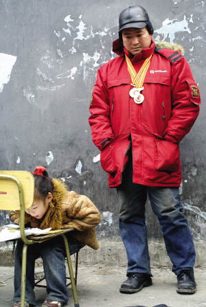 在覃紀(jì)虎的“賣場”,他把榮譽(yù)證書及相關(guān)報道的剪報擺了滿地,并打出賣獎?wù)碌恼信,女兒曉艷在一旁靜靜地伏在一把椅子上寫作業(yè)。不時有過往的行人前來觀看,然后為他們捐一點(diǎn)錢。