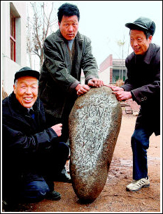 張步高發(fā)現(xiàn)一塊石頭上面刻著怪字的消息不脛而走,周圍的鄉(xiāng)黨紛紛前來(lái)看稀奇,可就是沒有一個(gè)人能認(rèn)得這怪字。為了弄清這塊石頭的來(lái)龍去脈,特別是它上面字的含義,張步高老人說(shuō)他半年來(lái),請(qǐng)了不少行家里手,甚至別人特意介紹的專家教授,可到目前,還是沒有人能說(shuō)出個(gè)所以然來(lái)。張老說(shuō)盡快揭開蒙在這石頭上的神秘面紗,已成為自己的一塊心病,希望有關(guān)部門和專家能和他聯(lián)系,把被人們傳得沸沸揚(yáng)揚(yáng)的石頭解釋得明明白白,真實(shí)可信。(記者 張波文/圖)