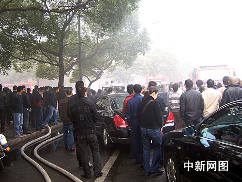 記者離火場五百米的溫州小南門即能聞到刺鼻的煙味,記者趕到現(xiàn)場時(shí),已經(jīng)有十幾輛消防車及救護(hù)車到場,街道上到處是水,留下滅火后的痕跡。目擊者告訴中新社浙江分社記者,火是從一樓東面的花店開始的,隨后蔓延到二樓;記者看到著火的溫富大廈二樓是一家娛樂城,娛樂城正不斷往四周冒著濃煙,還有消防車架起云梯從東面和南面用高壓水槍往著火樓層里噴水滅火。