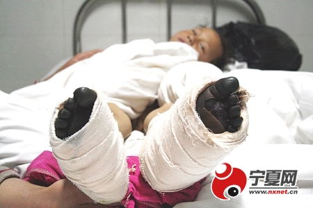 據(jù)楊二喜的姐姐楊銀蓮介紹,她們家住在西吉縣興盈鄉(xiāng)引黃溝村,那里常年干旱,家里的幾畝旱地是連年歉收,加上父親患有眼疾視物不清,母親神智低下,家庭生活非常困難。10年前,楊銀蓮嫁到了離家不遠(yuǎn)的一個(gè)村子。今年11月24日早晨,她父親急急忙忙到她家尋找母親和弟弟,她才得知母親和弟弟在頭一天就不見(jiàn)了。得到這一消息,鄰居、親戚20多人到處尋找,可是找了兩天都沒(méi)有消息。經(jīng)過(guò)商議,人們兵分幾路繼續(xù)尋找。11月26日,當(dāng)人們找到離家數(shù)十公里的白城村時(shí),一位老大爺說(shuō),11月25日,一個(gè)50多歲女人背著一個(gè)男孩在他家討過(guò)水喝。按照老大爺描述,證實(shí)這倆人正是他們苦尋多天的親人。11月27日,被困5晝夜的母親和弟弟終于在附近的一座山上找到了。楊銀蓮回憶說(shuō):“當(dāng)時(shí)母親和弟弟正坐在一個(gè)土坑里,弟弟僅穿著一件薄毛衫,臉凍得發(fā)紫,鞋只剩下一只。弟弟看見(jiàn)我的第一句話便說(shuō)‘大姐,我快凍死了”,回家后給弟弟換衣服時(shí)發(fā)現(xiàn),弟弟的雙腳已凍成了黑色。楊二喜告訴記者:“媽媽背我出來(lái)要飯,不知不覺(jué)就迷了路,一只鞋也不知道啥時(shí)丟了,我的腳在出門的第二天便失去了知覺(jué),這5天中,我們每晚都睡在草堆里,陪伴我的除了媽媽,就是饑渴和寒冷!