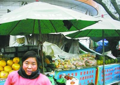 這里的商販全都沒撐傘,除兩個水果攤外,其他服裝攤也沒使用統(tǒng)一車輛。記者問一水果攤商販:“你們怎么沒買市容局的傘?”“買了兩把,天冷了,用不上就放家里了!币簧特溦f。