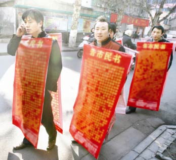 昨日上午,硚口區(qū)寶豐二路一居民樓下,5名農民工身披“字書衣”討薪,引來眾多路人圍觀。記者近距離觀察,發(fā)現該“字書衣”由兩片長1.5米左右、寬0.5米左右的硬塑料布組成,記述了13名農民工討薪三年以及被人持槍打傷的經過,塑料布上還留有農民工代表及包工頭的聯系方式。