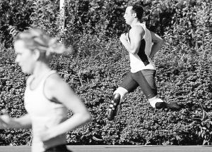 南非體育科學(xué)研究所的羅斯·塔克(RossTucker)持有類似觀點(diǎn)。他還指出義肢的另一特性:從來不會(huì)感到疲憊。不同于木腿簡單的支撐功能,在體重壓力作用下,運(yùn)動(dòng)義肢會(huì)在接觸地面時(shí)彎曲,然后在換步時(shí)彈開,從而把運(yùn)動(dòng)員垂直施與跑道的壓力轉(zhuǎn)化成水平方向的動(dòng)力。