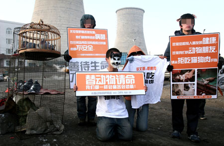 一名大學生穿著短袖,頭上戴著“貓咪”面具,身前放著一個“替動物請命”的牌子跪在馬路上,一個女孩舉著印有“拒吃貓狗肉”的T恤衫跪在他旁邊。他們身后,幾名學生拿著“善待生命、刀下留情”的廣告牌陪同,學生們在瑟瑟的寒風中“為動物請命”,這是昨日發(fā)生在鴿子市場的一幕。他們希望用這種方式感染那些虐殺動物的商販,讓商販們放下“屠刀”、珍愛生命。