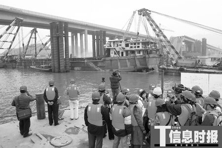 據(jù)悉,橋體拆除工作的第一階段工作包括穩(wěn)定墩、支架墩、牽制墩、臨時墩及牽引穩(wěn)定體系等。記者昨天現(xiàn)場看到,第一階段穩(wěn)定墩、支架墩的全部施工工作已完成,主牽引墩、1#、2#、3#牽制墩,1#、2#、3#臨時墩的承臺也全部完成,1#、2#、3#臨時墩鋼橫梁也均已至位,即將安裝到位。切割船體移開后,坍塌斜梁將會通過牽引系牽制穩(wěn)定,分塊切除清理,“除了斜梁段將會被切斷拆除外,緊接斜梁的橋身也要被切除一部分,長度大約為88米,這項工作我們力爭用兩個月時間清理完善!