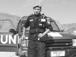 他今年36歲,曾兩次出任國際維和警察, 重復(fù)經(jīng)歷了貧窮、戰(zhàn)亂、恐怖和險惡的生死考驗,出色地完成了維和任務(wù),榮獲兩枚聯(lián)合國和平勛章。他叫吳強,畢業(yè)于吉林大學(xué)計算機系和法學(xué)院,獲計算機專業(yè)學(xué)士學(xué)位和法律專業(yè)碩士學(xué)位。國家一級運動員。1996年參加公安工作,是我。ㄗⅲ杭质。┦孜粐H維和警察。目前任省公安廳辦公室副主任,指揮中心副指揮長。前不久吳強榮膺第18屆“中國十大杰出青年”的殊榮。