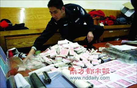 隨后,偵查員將小轎車(chē)車(chē)主吳某押至其租住的浪尾村出租屋。民警沖進(jìn)房間,將正在房間內(nèi)整理假票的吳某妻子抓獲,當(dāng)場(chǎng)繳獲成品假火車(chē)票3張和半成品假火車(chē)票3萬(wàn)張,以及制造假火車(chē)票的專(zhuān)業(yè)印刷排版工具一批。偵查員在抓獲主要犯罪嫌疑人的同時(shí),另一路專(zhuān)案組偵查員也同時(shí)直撲藥店,一舉將正在該藥店進(jìn)行假票銷(xiāo)售交易的嫌疑人尹某和廖某當(dāng)場(chǎng)抓獲,在該藥店火車(chē)票代售點(diǎn),警方搜出了大量用于訂票所用的單據(jù)和憑證。