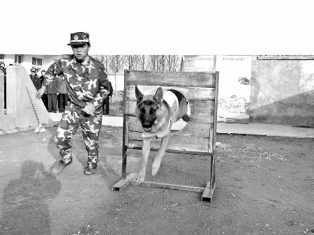 搜救犬隊(duì)是一個獨(dú)立的小院,里面有4間嶄新的狗舍,還有一個小型的訓(xùn)練場?吹侥吧耍瑑蓷l體格威猛、面目猙獰的大犬趴在狗舍的鐵柵欄上,炸雷般地吼叫著,讓人望而生畏。身著軍裝的馴導(dǎo)員走上前去,兩條大犬馬上變得溫柔起來,像可愛的小孩子,毛茸茸的大頭在馴導(dǎo)員的手上蹭來蹭去。