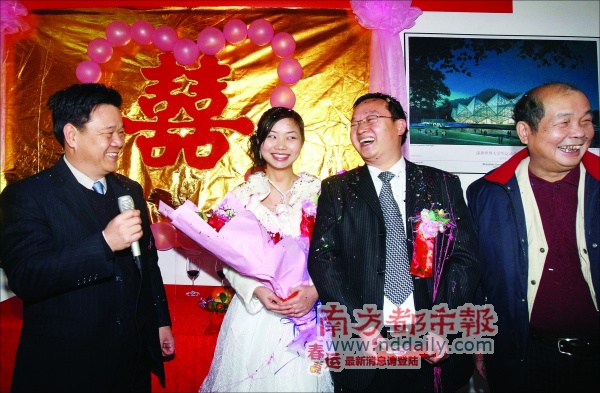 而得知這一消息后,昨日到施工工地慰問建設(shè)者們的呂銳鋒和梁道行兩位副市長(zhǎng),為新人們當(dāng)了一回特殊的證婚人,除了給新人包上兩個(gè)大紅包,兩位副市長(zhǎng)都祝愿新人愛情美滿,白頭偕老。