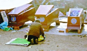 昨日,唐縣倒馬關(guān)鄉(xiāng)夾子村柴振國(guó)家中,白色塑料布將前后院罩住,院內(nèi)搭起了簡(jiǎn)易的靈棚。7口大棺材和2口小棺材擺在門(mén)前,9具尸體停放在前后院,陣陣哀哭聲從靈棚中傳出。
