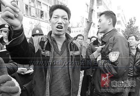 據(jù)李賢堂說(shuō),其家兄弟4人來(lái)昆明已有多年。二哥李賢友以前受過(guò)傷,醫(yī)治好后便身帶殘疾,與二嫂在昆明做米線生意。上午10點(diǎn)左右,他知道二哥送餌塊途經(jīng)人民東路時(shí)被城管打了,就迅速跑了來(lái)。“看到二哥躺在地上,餌塊散落一地,我就跑到一輛白色面包車前,攔住去路,沒(méi)想到,七八個(gè)男子就過(guò)來(lái)打我,他們那么多人,我咋個(gè)還手,打得我頭昏眼花,我只好抓住先打我的那個(gè)不放手!