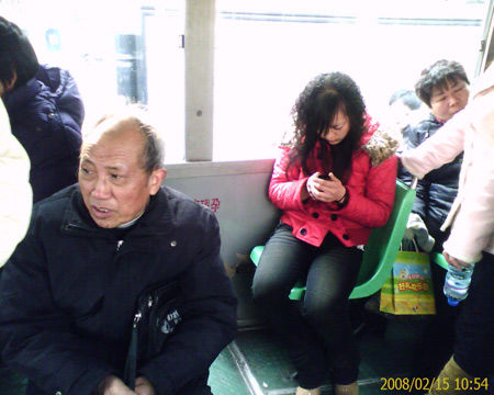 “雖然這樣,但該女子假裝沒有聽見,依舊坐在那里發(fā)她的短信,我抱著孩子在其旁邊站了一會,該女子還是依然如故,好在很快有人下車了。”網(wǎng)民“techuen333666”說,于是,他抱著孩子坐在駕駛員后面的工具箱上,用手機給那個搶座的女子拍了照片。