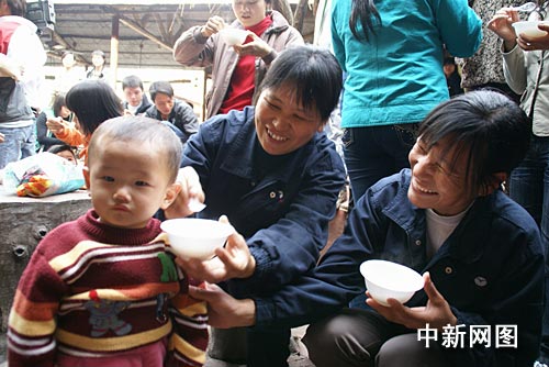 “吃湯圓,賣湯圓,一碗湯圓三毛錢!痹趧(dòng)聽的歌謠聲中,游客臉上都帶著興奮的笑容,按順序排隊(duì)等候工作人員的分吃湯圓。記者粗略的估計(jì)了一下,10余工作人員耗時(shí)一個(gè)多小時(shí)才把大湯圓分完。