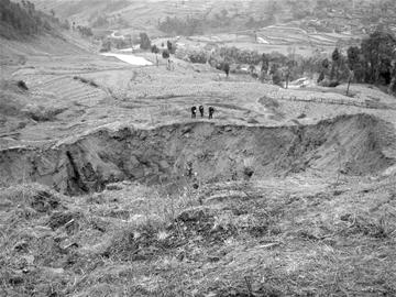白果村楊家溝山坡上出現(xiàn) “天坑”后,當(dāng)?shù)剜l(xiāng)政府、國土所工作人員都到現(xiàn)場進(jìn)行了調(diào)查。據(jù)調(diào)查,在方圓數(shù)公里的范圍內(nèi),并沒有發(fā)現(xiàn)挖煤等采掘行為,歷史上也沒有,形成原因成了謎。目前,相關(guān)部門正在對(duì)出現(xiàn)“天坑”的原因作進(jìn)一步勘察。(文/圖黎濤歐迪勇記者 李罡)