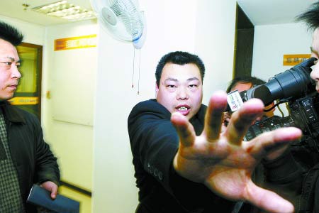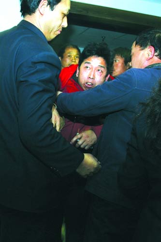 站在門(mén)外的十幾個(gè)民工看到保安動(dòng)手推搡記者,就闖了進(jìn)來(lái)。一穿紅色夾克的民工兩手作揖,幾次跪到地上,說(shuō)“要打你們打我吧,不要打人家記者”。