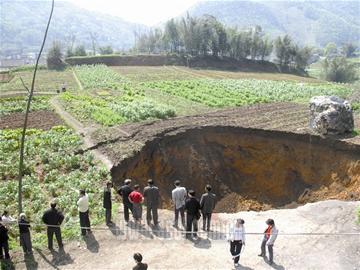 2008年3月25日凌晨,宜賓江安縣紅橋鎮(zhèn)五閣村發(fā)生了局部地面塌陷,形成大小不等的3個巨型“天坑”,呈直線展開,長約400米。塌陷嚴重威脅到附近的11家住戶57人。險情發(fā)生后,江安縣委、縣政府及當?shù)丶t橋鎮(zhèn)政府立即緊急疏散塌陷影響區(qū)域內(nèi)的居民,并對“天坑”實施24小時的臨時警戒,防止意外事故發(fā)生。截至昨日,國土資源部門的地質(zhì)專家現(xiàn)場查勘得出的初步結(jié)論是:該地面塌陷是因為地下溶洞引發(fā)的小型巖溶塌陷,是自然形成的地質(zhì)災(zāi)害;進一步的結(jié)論及處置措施待觀察3—5天后再定。