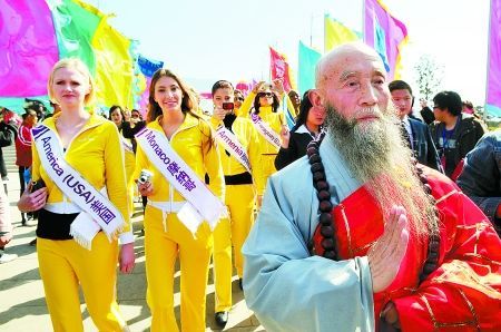 昨天上午10時(shí),滿載115名美女的大巴車停在了少林寺山門前,一位白須僧人雙手合十站在路中間,兩旁是8位身穿黃色袈裟的年輕僧人?吹铰糜涡〗阌孀邅恚醉毶宿D(zhuǎn)身在前帶路,8名年輕僧人分列隊(duì)伍兩旁。