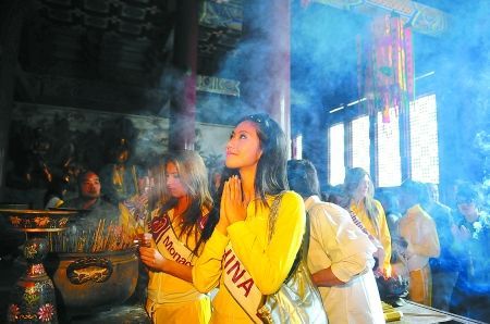 在山門口,一對(duì)20多歲的小夫妻也跟著大批游客一起看來自世界各地的美女。也許是看到男孩眼神一直停留在美女身上,女孩就一把挽過男孩的手臂,很溫柔地問:“老公,我美還是旅游小姐美?”男孩很機(jī)靈,馬上轉(zhuǎn)過頭看著女孩說:“在我心里你永遠(yuǎn)都是最美的,在我眼里,旅游小姐是最美的!敝車挠慰秃逄么笮,女孩打了男孩一拳,臉紅紅地笑了。