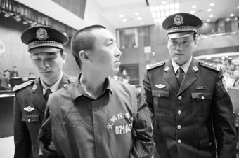 下午3時(shí)10分,待法庭書記員宣讀完法庭紀(jì)律后,宣判開始了。在三百多雙眼睛的注視下,在上百臺(tái)照相機(jī)、攝像機(jī)的聚焦下,許霆被法警押上了被告席。穿著天看(天河區(qū)看守所)1643號(hào)藍(lán)色看守服的許霆,臉上還是那么白,還是那么鎮(zhèn)定。法警解開手銬后,他端坐在法庭被告席上,雙手分開緊緊地貼在了膝蓋上。負(fù)責(zé)該案的審判長(zhǎng)開始宣讀審判書,許霆始終目不轉(zhuǎn)睛地緊盯著他。