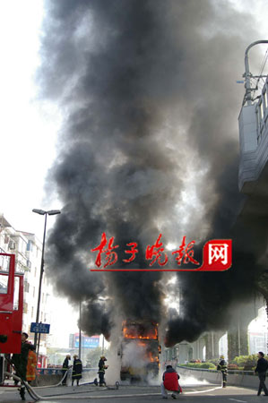 昨天上午7時(shí)55分,一輛雙層100路公交車在南京市雨花西路高架橋沿線尾部發(fā)生自燃,濃煙升騰數(shù)十米。時(shí)值上班高峰,公交車內(nèi)有乘客60多位。一騎車上班的市民發(fā)現(xiàn)火情后,奮追100多米,向駕駛員通報(bào)火情,隨即司機(jī)停車并及時(shí)疏導(dǎo)乘客,后因火勢(shì)太大,公交車瞬間成了“火”車,還危及地鐵中華門站10多米高正在運(yùn)行的地鐵線。隨即,消防官兵趕到現(xiàn)場(chǎng),撲救大火。整個(gè)過程中,沒有乘客受傷。但是大火將公交車燒成了一個(gè)空殼,烤化了附近的店家門面招牌,熏黑了地鐵柵欄,道路旁的植物也被烤死。