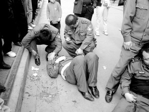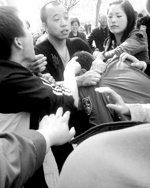 13日15時(shí)25分,讀者張先生撥打本報(bào)熱線反映說,數(shù)人正圍毆執(zhí)法人員。幾分鐘后,記者趕到現(xiàn)場,兩名執(zhí)法人員躺在地上,其中劉奇嬌已經(jīng)昏迷,旁邊有嘔吐物,同事張君毅正掐著他的人中,緊急搶救。王某在旁邊高聲叫喊:“執(zhí)法人員打人了!比欢,正在圍觀的群眾張林友讓記者看了他用手機(jī)拍的照片,生氣地說:“真是惡人先告狀,是他們喝酒后打執(zhí)法人員的!