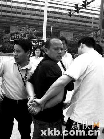 “抓住他!”眼見假證販子要逃,記者顧不得多想,兩步沖上前去抓住胖男,胖男拼命掙扎,由于他的身材比記者高大,他幾乎將記者摔倒在地!翱靵碜プ∷!”記者一邊雙手用力鉗住對方一邊大喊!皠e動!”兩名便衣警察沖了上來,把胖男按倒在地,隨即將其制服。(王華平 王炳暉 陳彬)