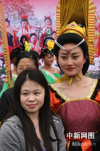 中新網(wǎng)4月19日電 (李洋)4月正是牡丹盛開的時節(jié)。“網(wǎng)上看河南”采風團18日先后探訪了洛陽國際牡丹園和國家牡丹園,遍賞中國和世界的名貴牡丹品種。當?shù)剡組織演藝團體盛裝重現(xiàn)唐朝武則天時期的風貌,不少女記者對武則天這一歷史人物情有獨鐘,還紛紛與“武則天”合影留念。