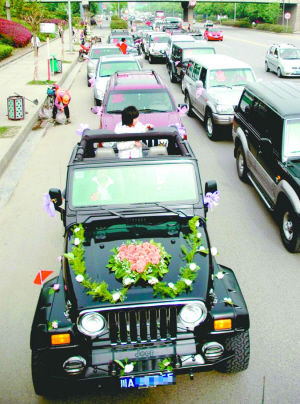 三菱帕杰羅、陸地巡洋艦、大切諾基、豐田普拉多、本田CRV、牧馬人……昨日上午,52輛各種品牌的越野車(chē),組建成綿延1公里長(zhǎng)的婚車(chē)隊(duì)伍,從西門(mén)穿城到東門(mén)迎娶美麗的新娘子,又浩浩蕩蕩地朝東湖公園婚禮現(xiàn)場(chǎng)進(jìn)發(fā),好不拉風(fēng)!新娘子說(shuō):“戀愛(ài)8年啦,就想要這么一場(chǎng)轟轟烈烈的婚禮!”