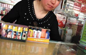 “老板,打火機多少錢一個?”記者試探著向店里的一位中年婦女詢問價格!皢钨u2元一個,如果你要的多,可以便宜點給你!敝心陭D女稱如果一次購買50個打火機,單個以1.5元出售。記者以批發(fā)大量打火機為由,想讓店鋪老板說出直接聯(lián)系打火機制造廠商的方法,但中年婦女擔心生意被搶,堅決不肯透露任何信息。“你們要買可以先付訂金給我,我打電話給賣火機的人預(yù)定,你們要多少都可以!钡曛髡f艷照打火機也是最近才進的貨,還比較好銷,生意好的時候一個月能賣出50個左右?从浾吣弥饳C觀察了一陣并沒有購買的意思,店主開始有些警覺起來,打算將裝有艷照打火機的盒子收起來!叭绻肱l(fā)可以來找我!