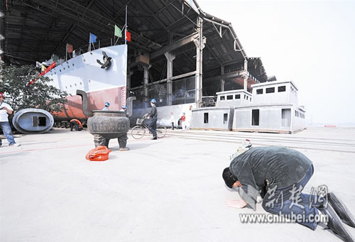 上午9時,位于白沙洲的武漢南華高速船舶工程股份有限公司內(nèi),21臺移船小車在絞索的牽引下,沿鋼軌緩緩將中山艦送到移船大車上。約10:10,移船大車在四臺牽引機(jī)車牽引下,載著中山艦沿著南華公司的滑道,向江邊駛?cè)ァ?/p>