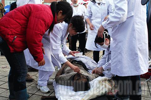 東汽體育館旁邊有一個小學和一個高中,數(shù)百名學生遇難。直到下午5點多,體育館前的空地上仍有二十來具尸體被等待運走。