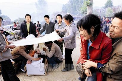 “我們已經(jīng)熬好一桶稀飯,你們快送給最需要的災(zāi)民吧!”昨日中午,驕陽似火,最大安置點之一的青川中學(xué)大門口,一輛長安面包車戛然而止,陳先文、陳先勇兩弟兄下車抬出一桶熱騰騰的稀飯,轉(zhuǎn)交給學(xué)校門口的工作人員!澳銈兪菑哪睦飦淼模熬了這么多的稀飯,災(zāi)民可需要。 备绺珀愊任摹昂俸佟毙α艘宦暎骸拔覀儚膹V元來,專門來給災(zāi)民熬稀飯!惫ぷ魅藛T急忙將稀飯?zhí)нM(jìn)學(xué)校操場,分給災(zāi)民。由于全縣水電氣都已經(jīng)中斷,傷員想喝一口稀飯是一件難事。喝著熱騰騰的稀飯,許多傷員眼淚就流下來了。陳先文、陳先勇兩弟兄來自137公里之外的廣元城里,做建材小買賣,“這次大地震,我們一大家人都沒一個人受傷,70多歲的老爹叫我們兩弟兄想辦法支援災(zāi)區(qū),回報社會。”這一提議得到全家人的贊同,都是普普通通的市民,咋個支援災(zāi)區(qū)呢?兩人跑了廣元城許多醫(yī)院,發(fā)現(xiàn)病人都喝不上稀飯。兩人商量到災(zāi)情最重的青川縣城,采購了1500斤大米,5個煤氣罐。
