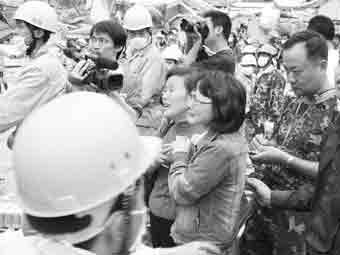 這時記者碰到一位從貴州遠道而來的母親龍金玉,她20歲的兒子蔣雨航埋在映秀一處坍塌的建筑里,生死不明。龍金玉哭著說,她從13日就得知兒子被埋了,新聞里和兒子單位的人一直說道路不通,她已經(jīng)連續(xù)4天幾乎沒吃任何東西了。15日她和家人到達成都,她再也不能等了,今天早上一個人偷偷溜出來,不管道路通不通,一定要到映秀。