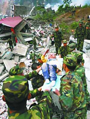 5月13日,武警戰(zhàn)士們從廢墟中營救出了3歲的郎錚,他吃力地舉起傷痕累累的右手,向軍人叔叔們敬了少先隊(duì)禮。郎錚的舉動(dòng)被很多人評價(jià)為“地震中最溫情的畫面之一”。