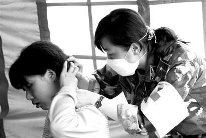 來(lái)到前線(xiàn),尹萍除了救治災(zāi)民外,還要負(fù)責(zé)給尸體消毒。只要挖出的尸體一露出頭或腳,尹萍就會(huì)第一個(gè)沖上去給尸體消毒,再由戰(zhàn)士抬出來(lái)。由于許多戰(zhàn)士都是第一次接觸尸體,多少有點(diǎn)害怕,抬一具尸體就要換個(gè)口罩。尹萍總會(huì)上前安慰:“尸體沒(méi)有腐爛就沒(méi)有毒,大家不要怕!