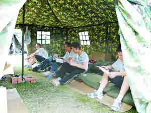 四川省北川中學(xué),這塊明顯有些泛舊的校牌,此時端正地懸掛在位于綿陽市長虹培訓(xùn)中心一座二層小樓的外墻上。培訓(xùn)中心的大門被拳頭粗的鐵鎖牢牢關(guān)緊,只有當教職員工或記者進出時,才會擠出一條狹窄的縫隙。走進其中,人們可以看到一座座整齊排列的綠色迷彩帳篷,不時會有孩子們擦身而過。他們的臉上沒有憂傷,盡管他們才剛從夢魘中驚醒。