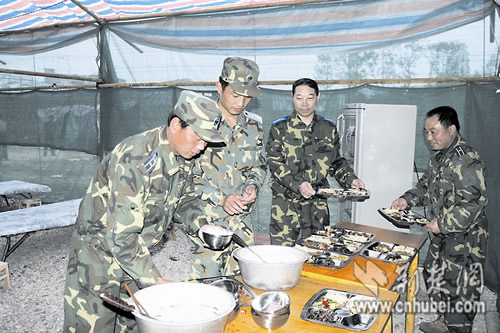 如何保障萬(wàn)余官兵的吃飯問(wèn)題,是一件非常重要的事情?战当筷(duì)早在出發(fā)之前,就攜帶了100余套能空投、便于運(yùn)行的野戰(zhàn)給養(yǎng)器材,每套設(shè)備在40分鐘內(nèi),可以做出120名官兵的飯菜,四菜一湯。而且,這種器材很輕便,只要2個(gè)戰(zhàn)士就能抬動(dòng)。幾天前,該部又調(diào)集了16輛野戰(zhàn)炊事車(chē),投放到漢旺、洛水和鎣華等鎮(zhèn),保障該部三個(gè)師的主力。這種車(chē)在40分鐘內(nèi)能完成150人的飯菜,四菜一湯,能隨著部隊(duì)移動(dòng),相當(dāng)于一個(gè)野戰(zhàn)廚房。